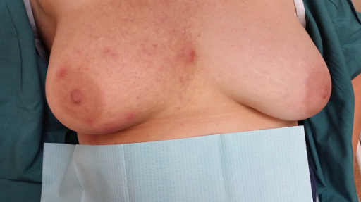 Radiation dermatitis is a common side effect of radiation therapy; a combination of radiation injury (ionizing radiation) and the inflammatory response that occurs. Although the skin is not often the primary target, the RT beams must pass through the skin to treat the underlying breast or chest wall. Radiation dermatitis may be evident one to four weeks after beginning treatment and can persist for several weeks post-treatment.