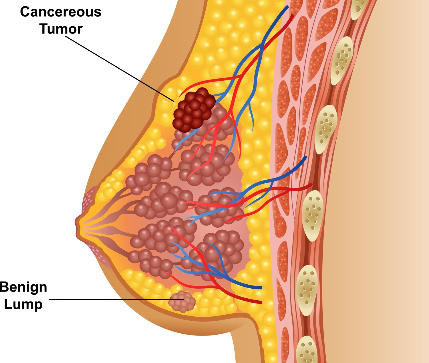 Lumps or thickened tissue can occur anywhere in the breast, including up to the collarbone and in the axilla. Breast lumps can present differently in different patients, e.g. they may be hard, soft, painless, painful, fixated, mobile, near the skin’s surface or deep in the breast tissue. A lump can also present as a thickened area of breast tissue that feels different from the rest of the breast.