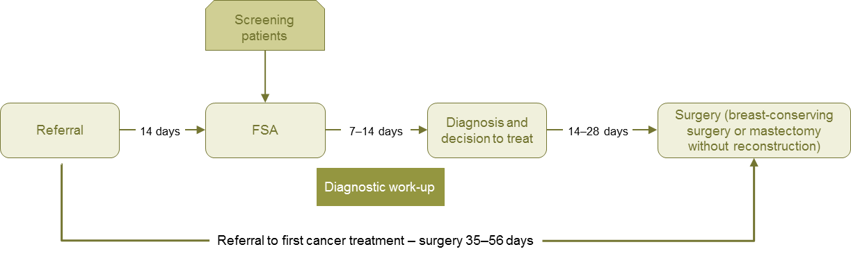 - Women recommended radiation therapy (where chemotherapy is not part of their treatment plan) have their FSA with a radiation oncologist within two weeks of receipt of referral.